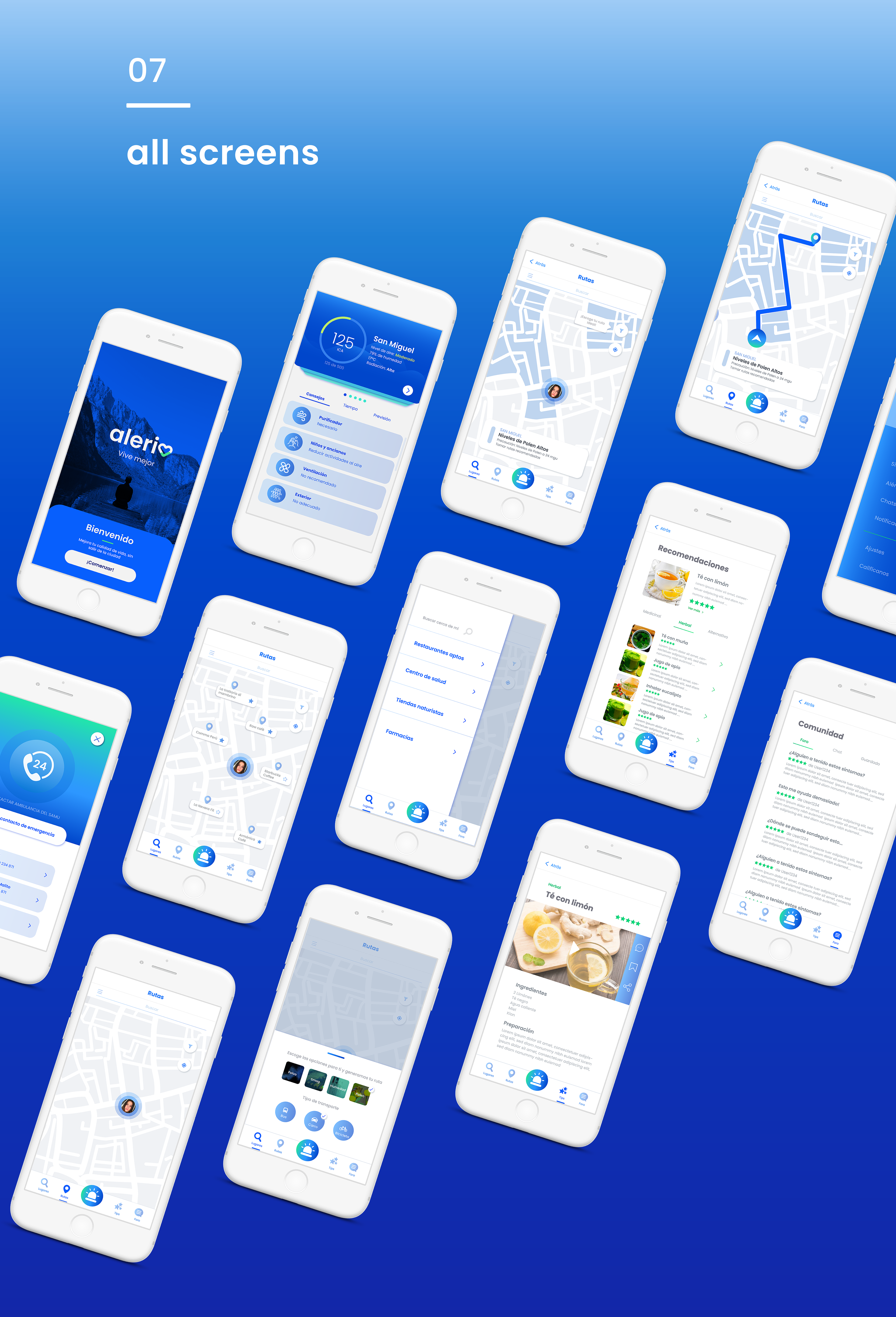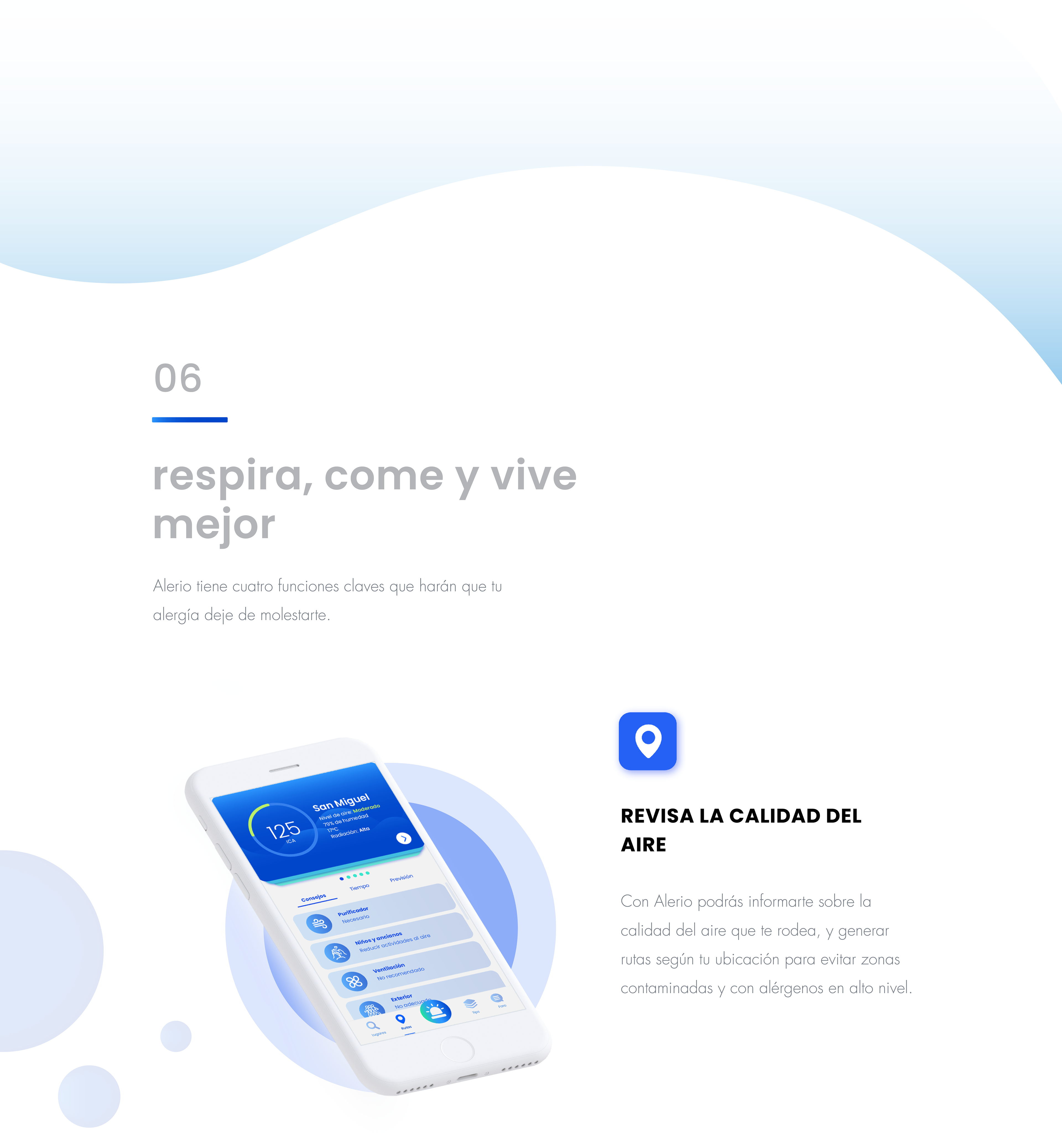 Alerio App es una app que permite a grandes rasgos aliviar, controlar y prevenir la sintomatología de las alergias. La app informará sobre consejos y recomendaciones de remedios fáciles y validados por especialistas. Además, mostrará las rutas más adecuadas que una persona con alergias respiratorias tiene que seguir con el fin de no agravar ni desatar su alergia. Asimismo, informar sobre los menús de los restaurantes más cercanos y saber si son aptos según las condiciones alimentarias de los usuarios.